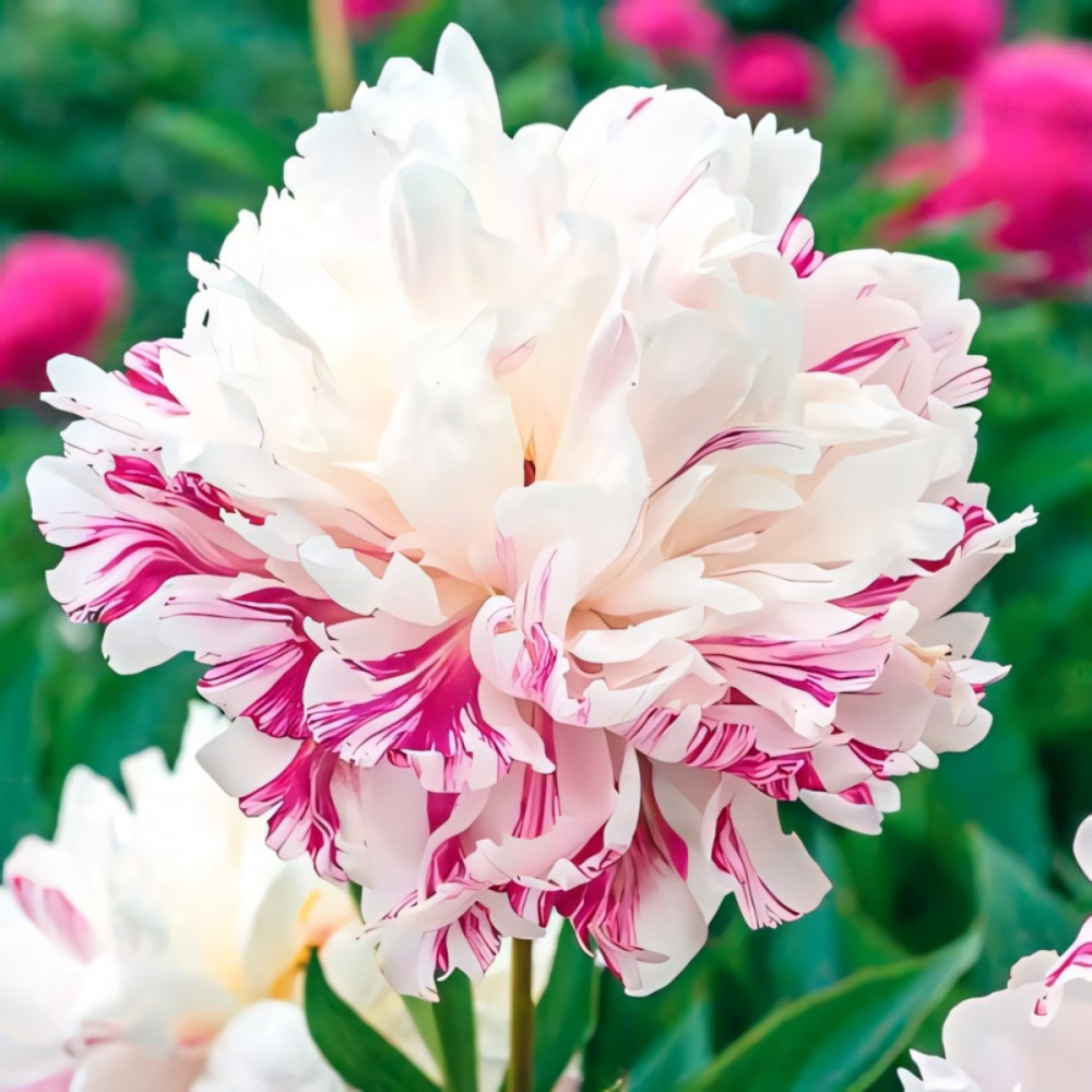 Пион Кэнди Страйп – это многолетний неприхотливый цветок, подкупающий очарованием и гармонией оттенков. Пышные белые соцветия имеют розовые и малиновые фрагменты, а внутри нежного шара затаилась оранжевая тычинка.