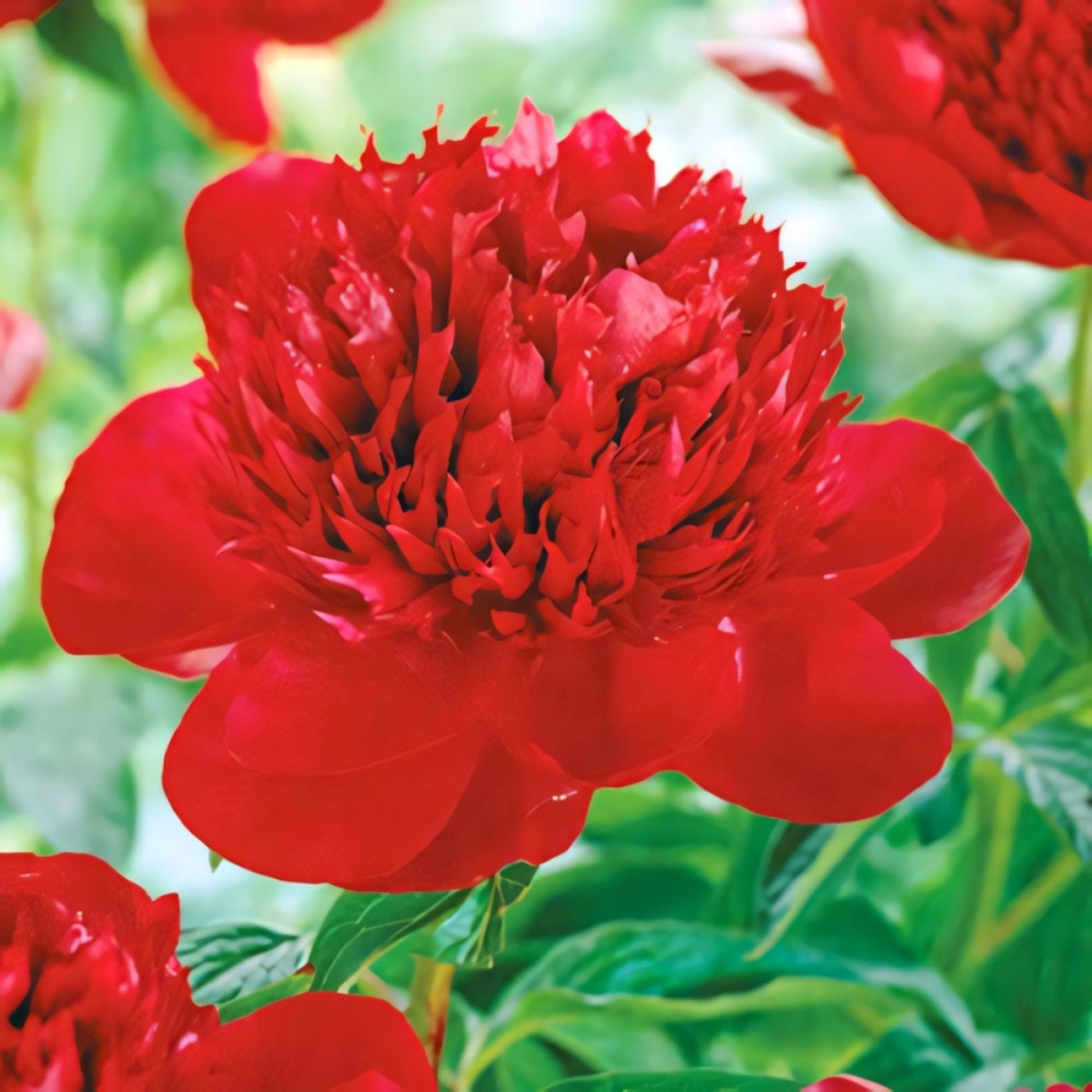 Пион Ред Шарм – это один из самых ярких сортов. Лепестки насыщенного алого цвета. Густомахровый цветок имеет форму шара. Наружные лепестки широкие, внутренние узкие удлиненные. Цветение приходится на конец мая – начало июня, в зависимости от климатических особенностей. Пион имеет декоративный вид весь сезон. После цветения куст остается ярко-зеленым с резной глянцевой листвой, осенью добавляются бронзовые оттенки.