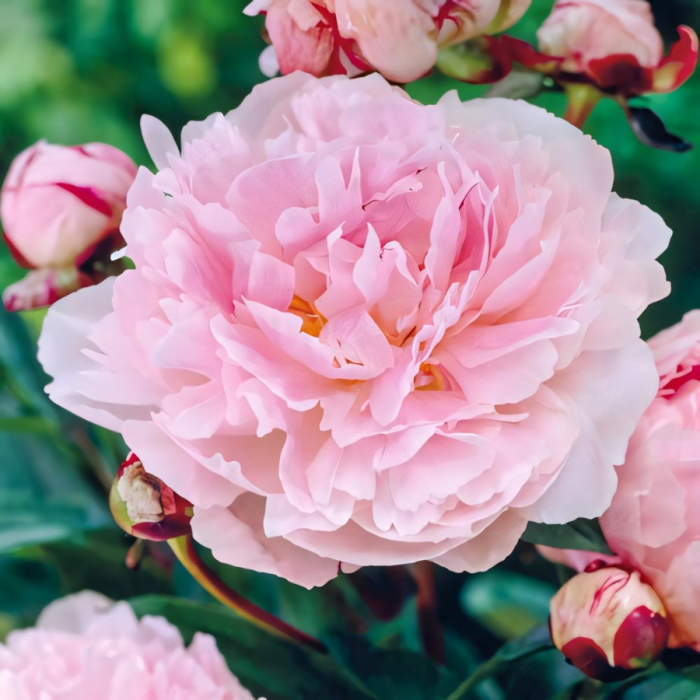 Пион Тафф – сорт с пышными и нежными розовыми цветками полумахрового типа. Соцветия полные, их диаметр 17-18 сантиметров, все лепестки вогнуты внутрь, они прелестно смотрятся на фоне ажурной листвы. Сам куст крепкий, компактный, высота 70-90 сантиметров. Цветок издает легкий приятный аромат.