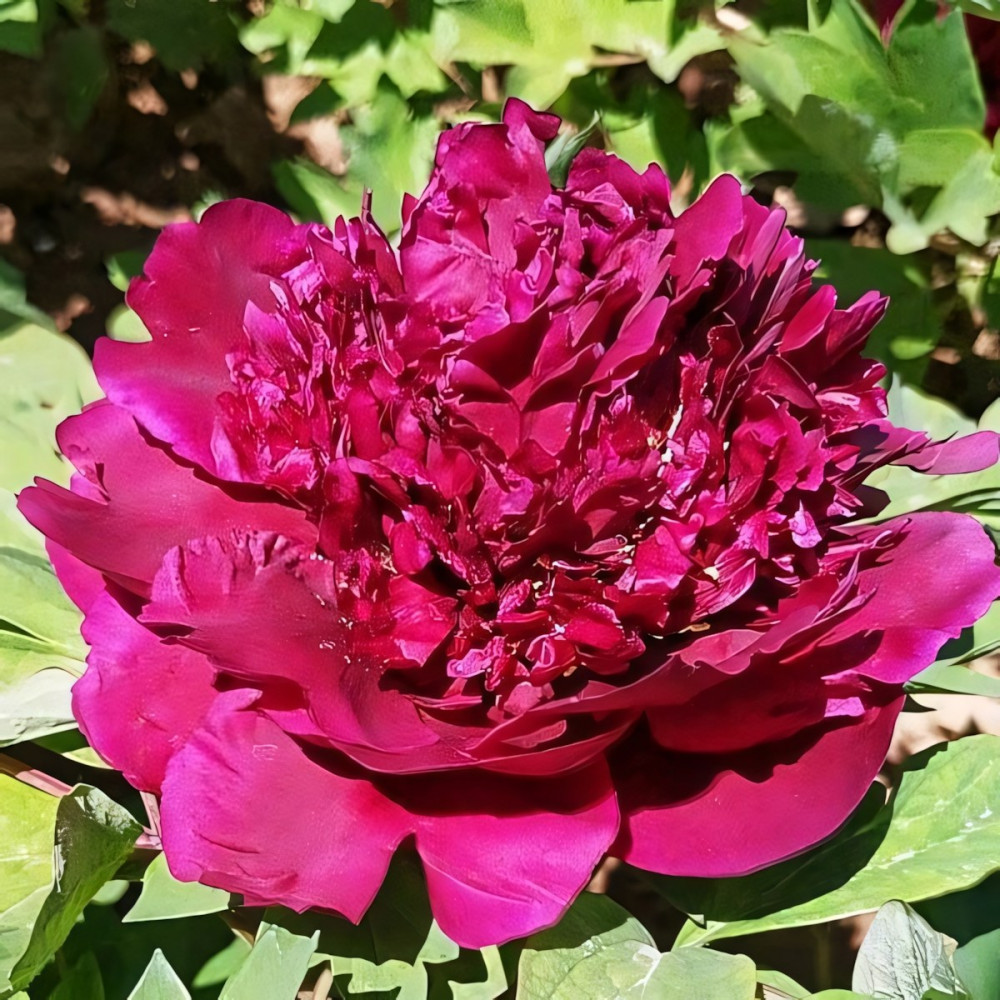 Цветки большие, окрашены в насыщенные оттенки фуксии. Листья упругие и широкие, махровые на ощупь. Корень пиона привит на травянистый.
