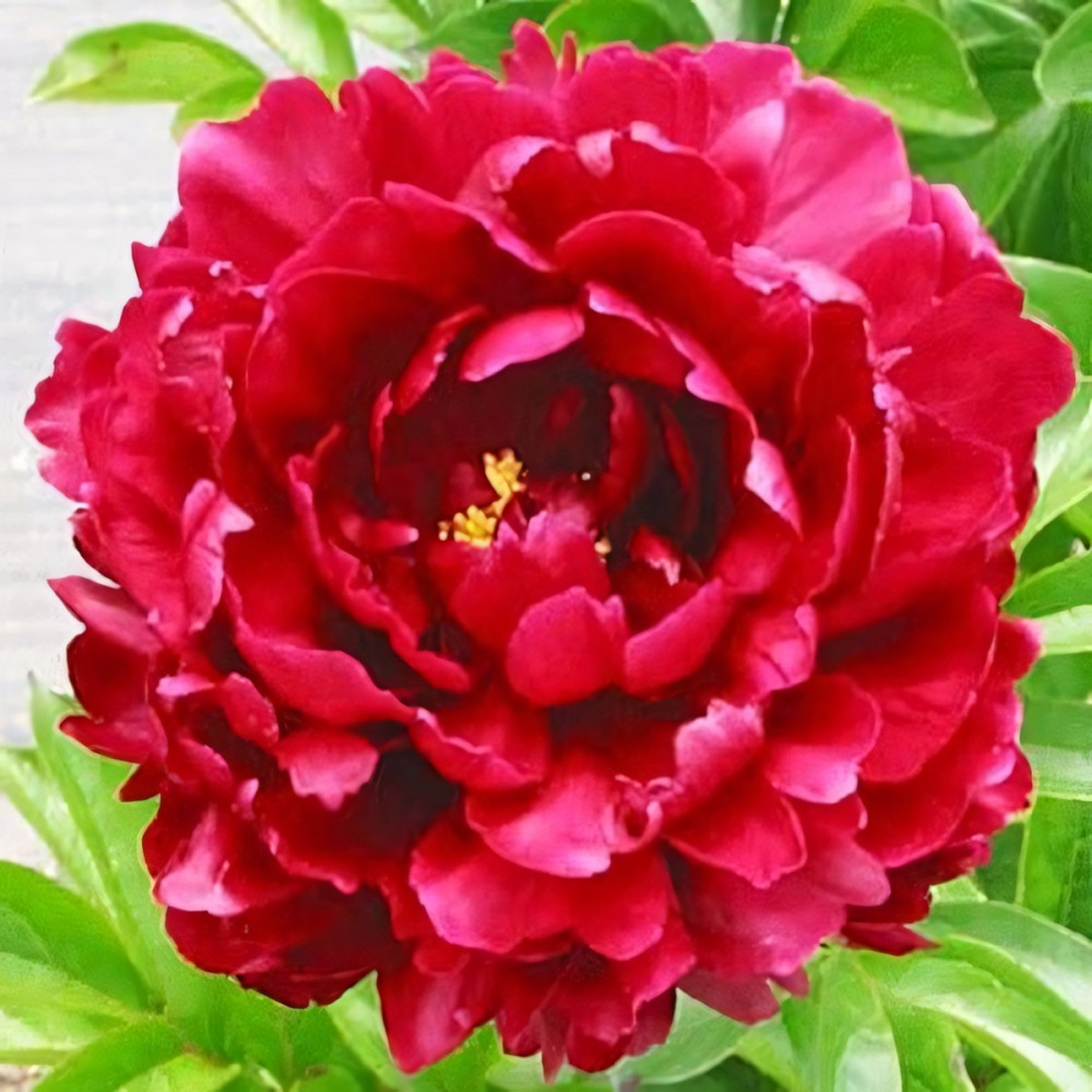 Пурпурно-красный цветок с тонкими гладкими лепестками. Кустарник имеет крепкий, довольно длинный стебель. На растении много цветов. Цветет в середине сезона. Корень пиона привит на травянистый.