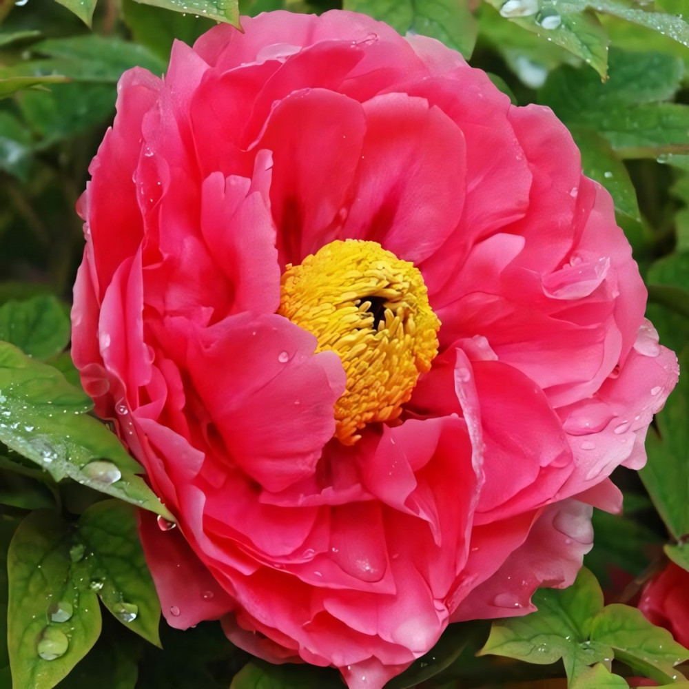 Куст высокорослый. Стебли раскидистые, листья крупные, темно-изумрудного цвета. Цветение у пиона настолько красивое, что от него невозможно отвести глаз. На одном кусте может быть от 30 до 70 бутонов. Цветки насыщенного розового оттенка. Корень пиона привит на травянистый.