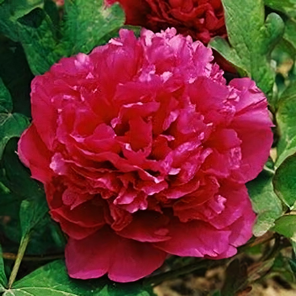 Корончатая форма соцветий с лепестками насыщенного красного цвета. Растет пион в виде кустарника с устремленными вверх ветками. Цветение в середине сезона. Корень пиона привит на травянистый.