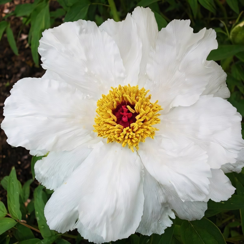 Знаменит своими белоснежными лепестками и высоким ростом. Растение высаживают в композициях с хвойными и лиственными видами. Лепестки блестящие. Растение рослое, пряморастущее. Рост энергичный, цветов множество. Цветение раннее. Корень пиона привит на травянистый.