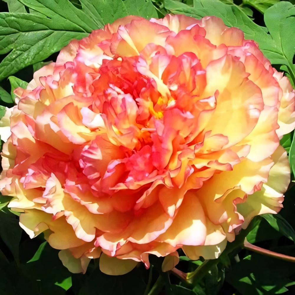 Листья крупные, ярко-зеленые. Цветки имеют шаровидную форму, густомахровые, желтовато-персикового цвета с нежно-розовой каемкой по краю лепестка. Цветение продолжительное: две недели и более. Бывает повторное цветение. Корень пиона привит на травянистый.