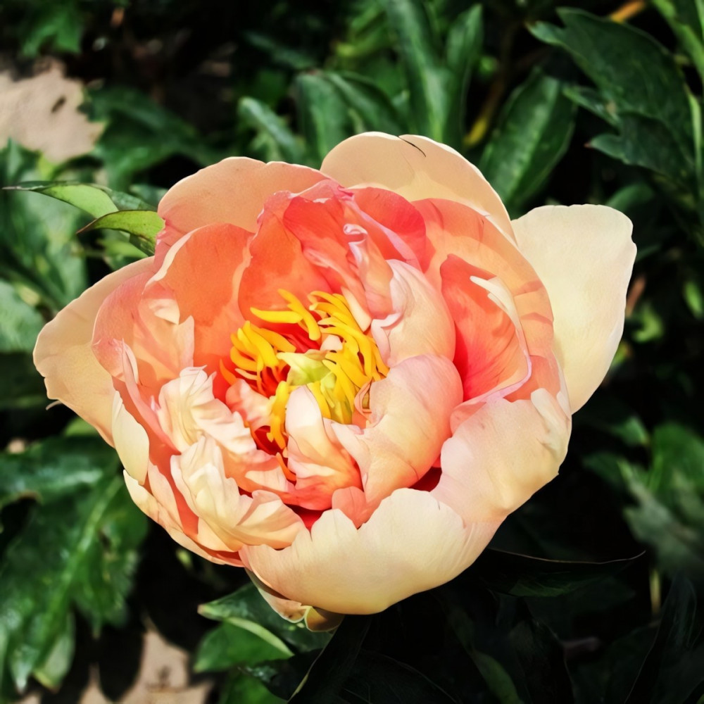 Получен в результате скрещивания травянистого и древовидного пионов. Цветы полумахровые и махровые. Внешние лепестки кремово-розовые. Бутон светло бежевый, при распускании - с нежными оттенками бежевого и розового цвета. Центр украшают желтые тычинки. Куст имеет прочные стебли и зеленую листву. Пион среднего срока цветения. Великолепно будет смотреться при групповых и одиночных посадках на газонах и цветниках. Используется для создания букетов.