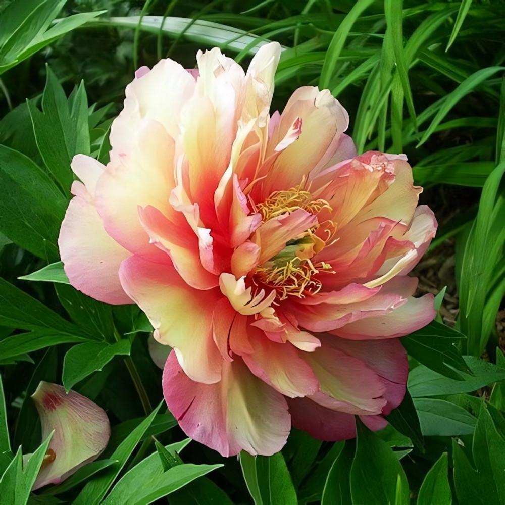 Махровый, имеет такую окраску соцветий, которая изменяется по мере распускания, переходя от вишнево-красного к розовому и желтому. В одно и то же время этот пион демонстрирует три разных оттенка. Цветение достаточно обильное. Характеризуется этот пион средним сроком цветения. Безусловно, это необычное создание подарит Вам массу положительных эмоций!