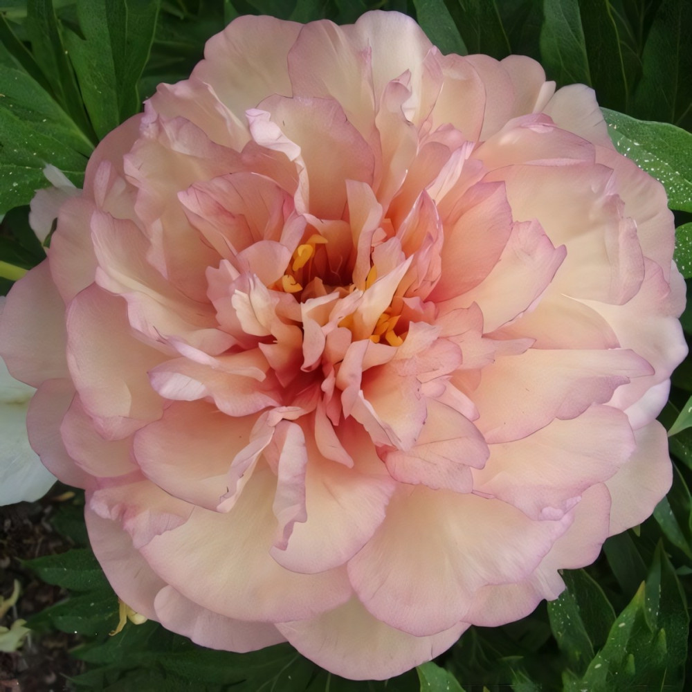 Эффектное многолетнее растение. Цветки с различными оттенками: вначале светло-бежевый, затем мягкого желто-розового цвета, в основании лепестков красные пятна. Листья пиона крупные, зеленые, декоративные. Куст компактный. Восхитительно будет смотреться в групповых и одиночных посадках на газонах и цветниках. Используется также для создания букетов.