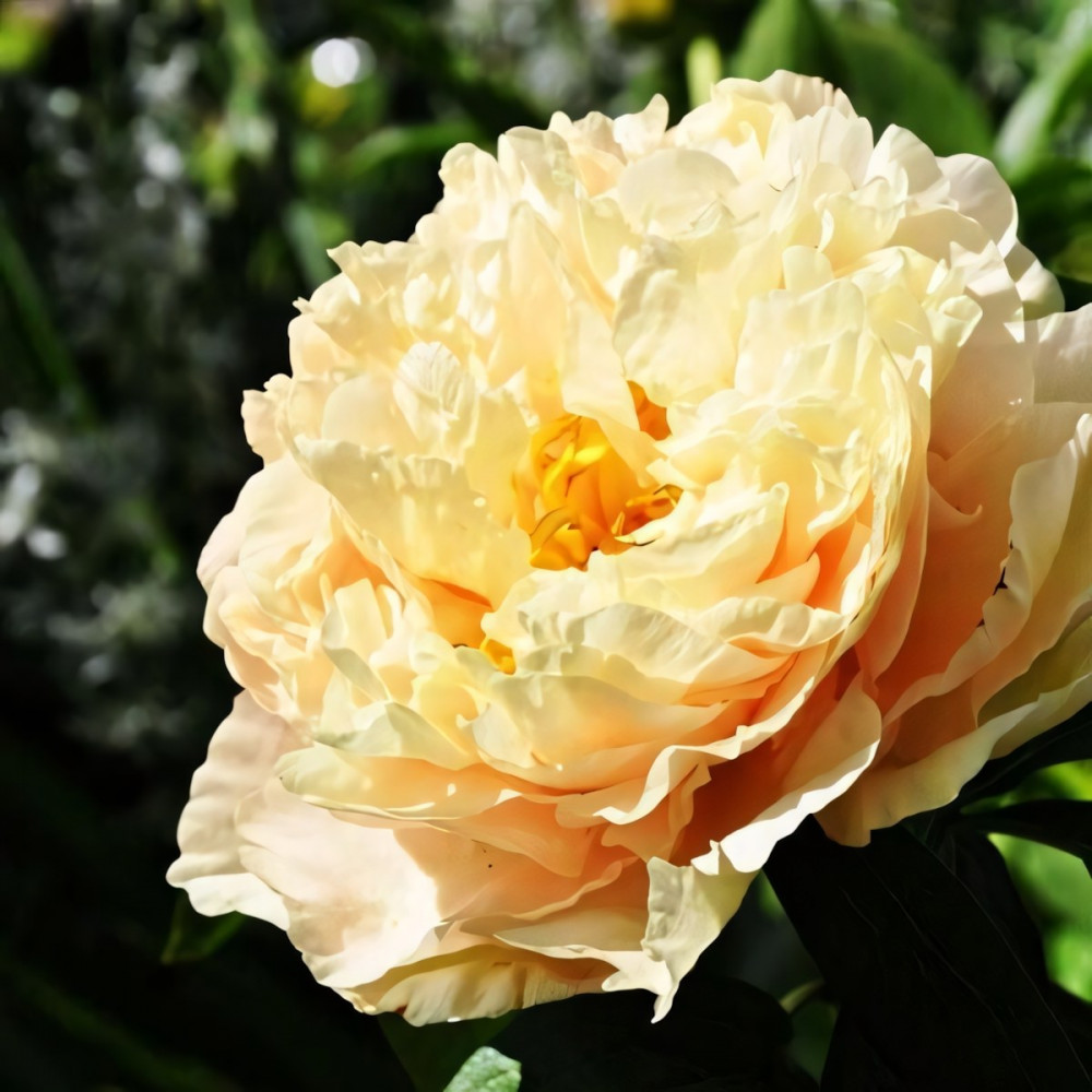 Цветок большой, махровый, кремово-жёлтый, светящийся. Лепестки красиво сложенные. В центре жёлтые тычинки. Листья тёмно-зелёные. Стебли прочные, прямые. Куст быстро разрастается. Срок цветения средне-ранний.