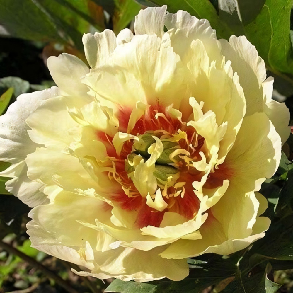 Получен в результате скрещивания травянистого и древовидного пионов. Цветки крупные, махровые или полумахровые. Аромат достаточно слабый. Окраска ярко-желтая с небольшими красными вкраплениями у сердцевины. Куст плотный, раскидистый, густооблиствленный. Прочные цветоносы, выдерживают крупные цветки и не позволяют кусту разваливаться. Сорт устойчив к болезням, гнили. Великолепно будет смотреться при групповых и одиночных посадках на газонах и цветниках. Используется для создания букетов.
