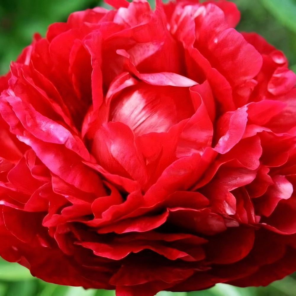 Махровый розовидный. Средне-ранний. Цветок блестящий, ярко-огненно-красный с легким сиреневым отливом. Плотного красивого сложения. Не выгорает. Лепестки крупные, складчатые, образуют в центре как бы несколько макушек. Куст раскидистый. Стебли непрочные. Цветёт обильно. Изумительный сорт для украшения сада и в букете. Один из лучших красных гибридов. Чемпион многих выставок.