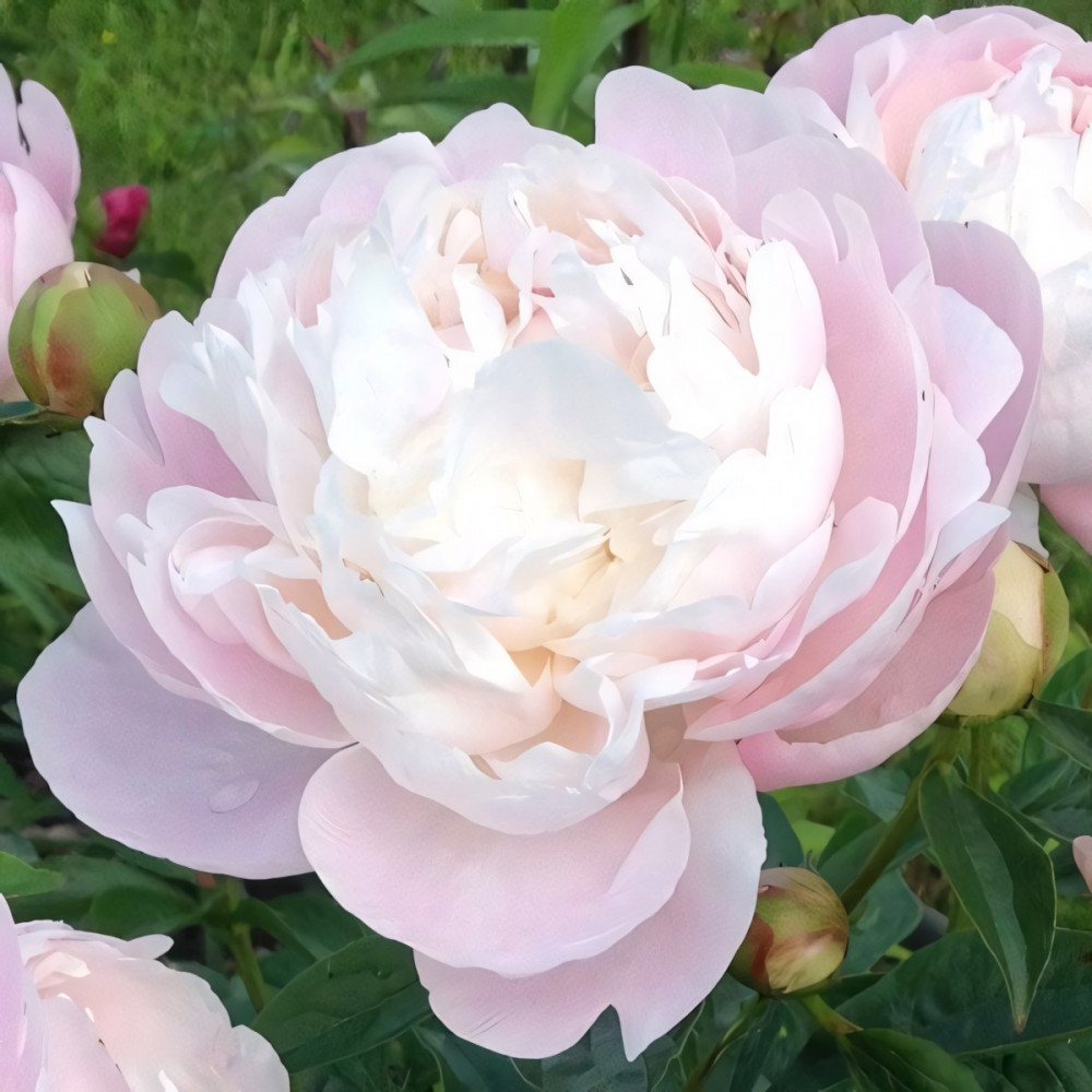 Роскошный нежный цветок, привлечет к себе внимание всех гостей и соседей. Великолепный махровый цветок розовидной формы. При распускании пиона, лепестки слегка розоватого цвета. При полном раскрытии, на солнце - белеют. Цветки хорошо держат форму. Запах нежный.