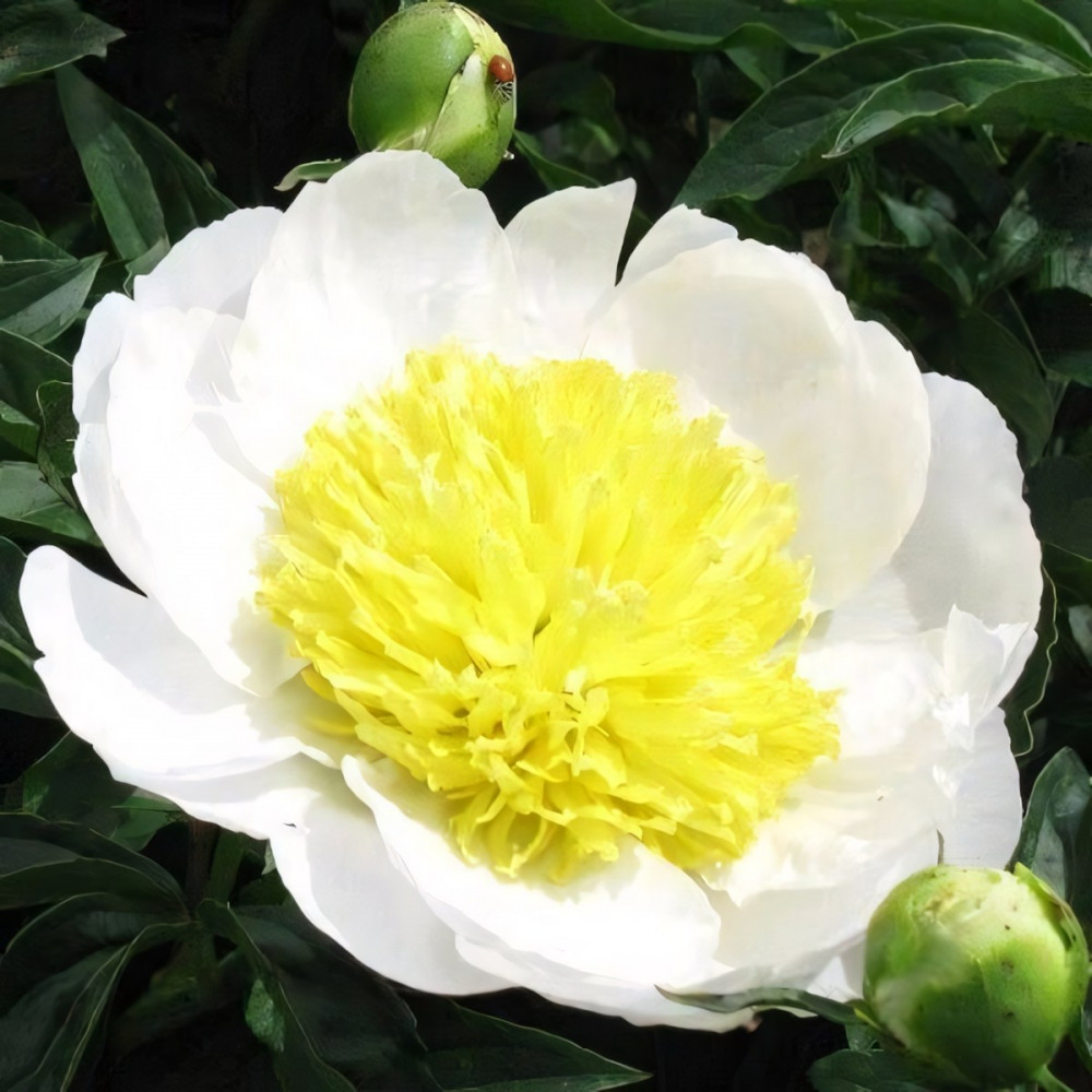 Новый сорт! Имеет большие анемоидные цветы с волнистыми белыми лепестками и желтой густомахровой серединкой. Стебли крепкие и сильные, хорошо держат массу роскошных бело-желтых цветов среди насыщенной темно-зеленой листвы. Гранд чемпион Америаканского общества пиона в 2009 г.