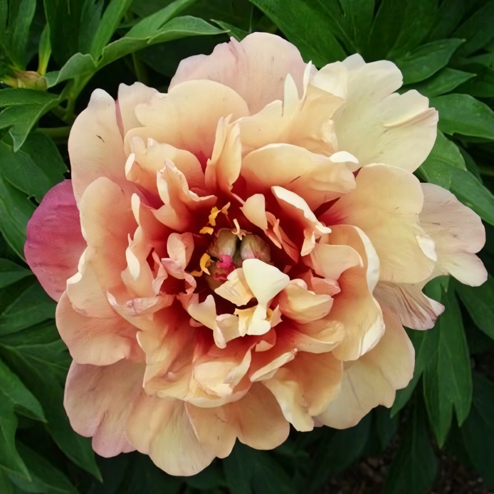 Редкий и необычный гибрид между садовыми пионами и древовидными. Высоко ценятся коллекционерами, пионы очень выносливы. Куст высокий, прочный с пышными зелеными листьями, которые стоят до и в осенний период. Огромные цветы двойные полумахровые, с легкими розовыми лепестками, темно-розовых вспышек и контрастными желтыми тычинками. Мягкий аромат.