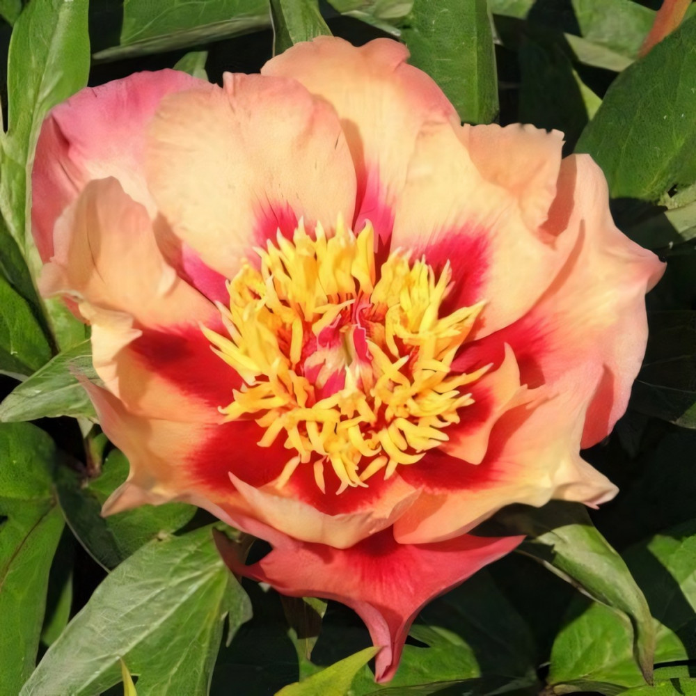 Очень красивый сорт! Полумахровые, ароматные цветки. Бледный жёлто-абрикосовый цвет, постепенно переходит в тёмно-розовый оттенок. Тычинки желтые. Куст округлой формы. Среднего срока цветения. Великолепно будет смотреться при групповых и одиночных посадках на газонах и цветниках. Используется для создания букетов.