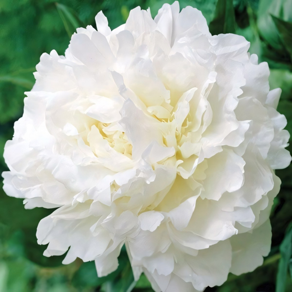 Один из лучших белых сортов! Форма цветка розовидная. Крупный махровый цветок белого цвета, в центре лепестки имеют более кремовый оттенок. Требуется опора для поддержки крупных цветков.