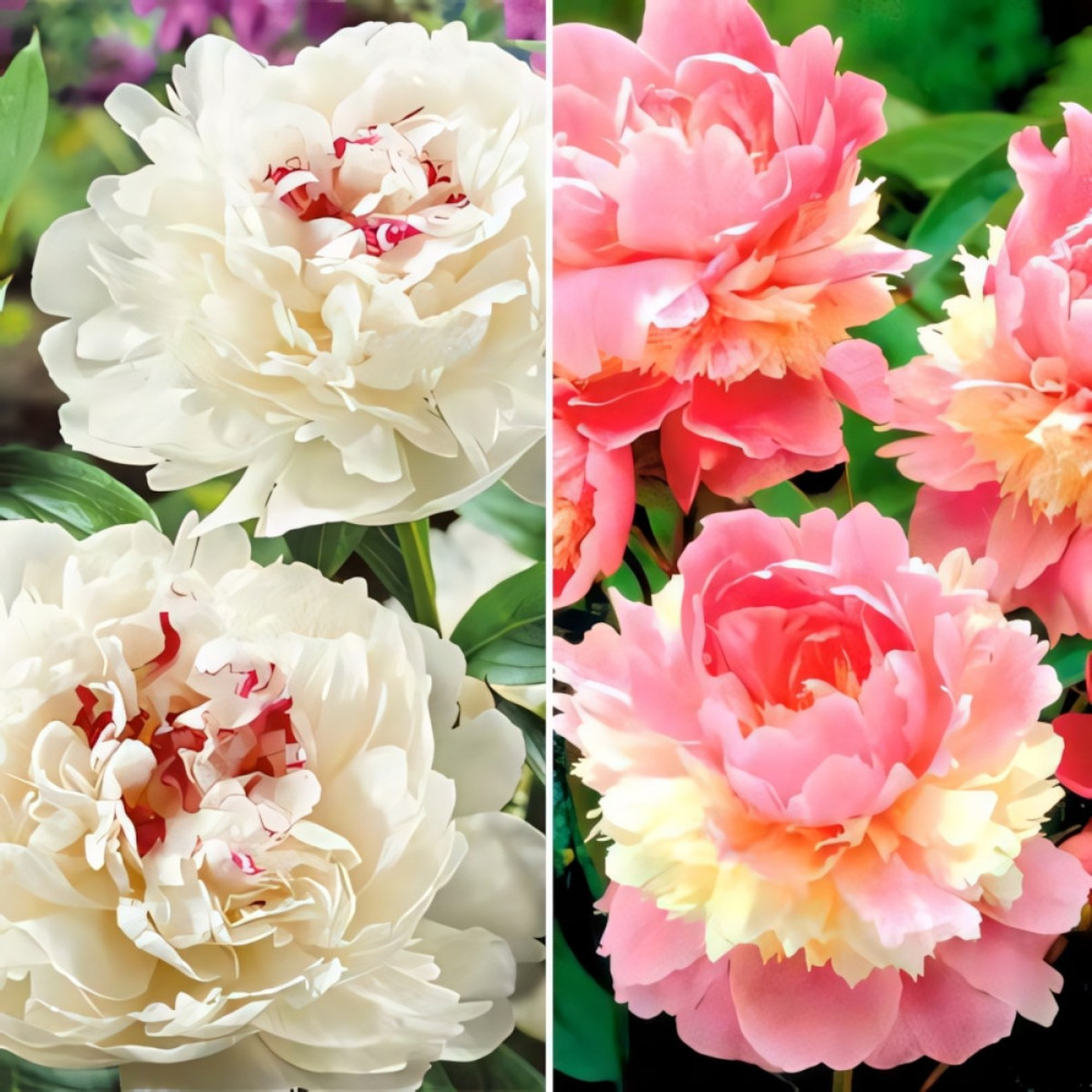 Розовые пионы в саду всегда великолепны, белые – очаровательны. Мы рекомендуем заказать комплект пионов из 2 сортов, великолепных в своем очаровании: